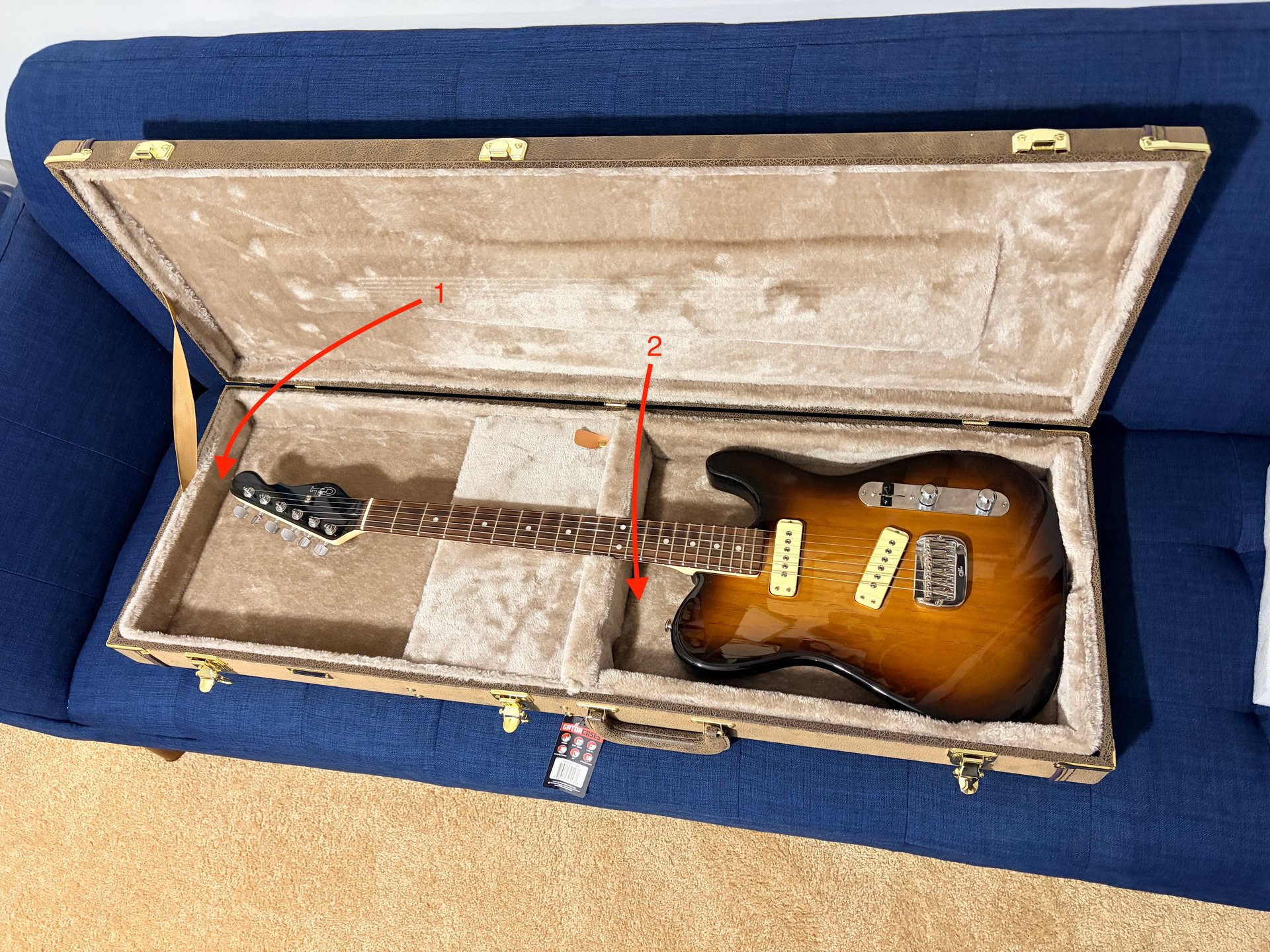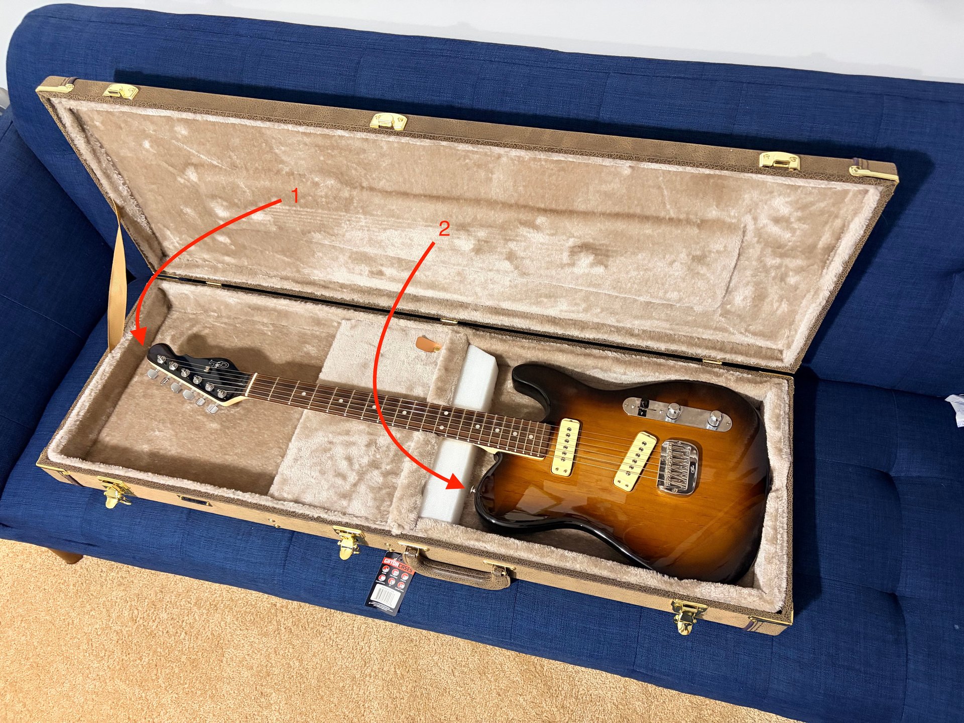 When it comes to putting an ASAT or Telecaster into a box-cut / shaped guitar case, you can run into an issue. When the amount of space between the headstock and the left side of the case (#1 in the image below) is less than the amount of space between the guitar shoulder and the case mid-line block (#2 in the image below), it means that, if you guitar were to shift to the left abruptly, your headstock would take that impact.