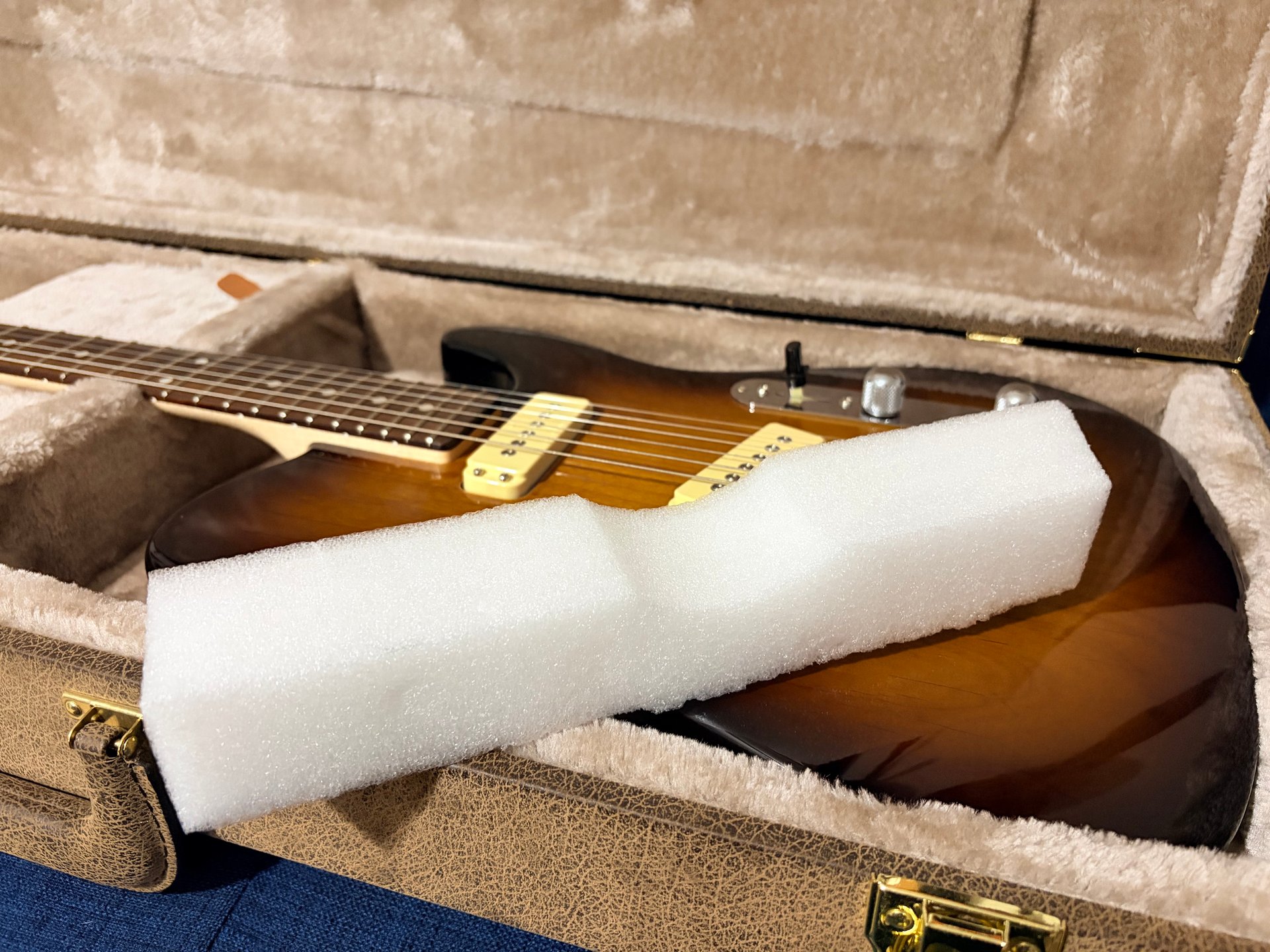 Luckily, there’s a simple solution for ASATs and Teles: make a small foam block with a neck scoop and put it between the mid-line block and the guitar shoulder: