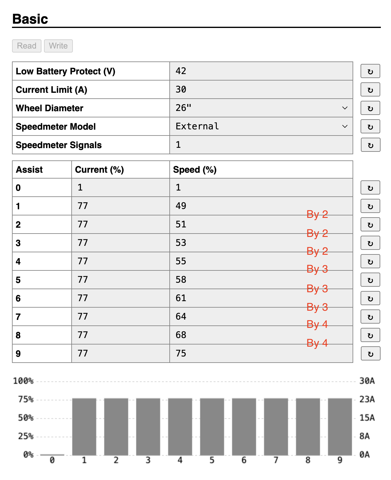 So ultimately we just need to set PAS tiers according to cadence, each with the same current limit, using very small steps in speed% to accommodate falling battery voltage. This means that the PAS level selector actually turns into a ‘preferred cadence’ selector! Unless you have a small, quick-draining battery, you’ll likely be able select a single PAS level when you get on the bike and leave it unchanged the entire ride! Super easy.