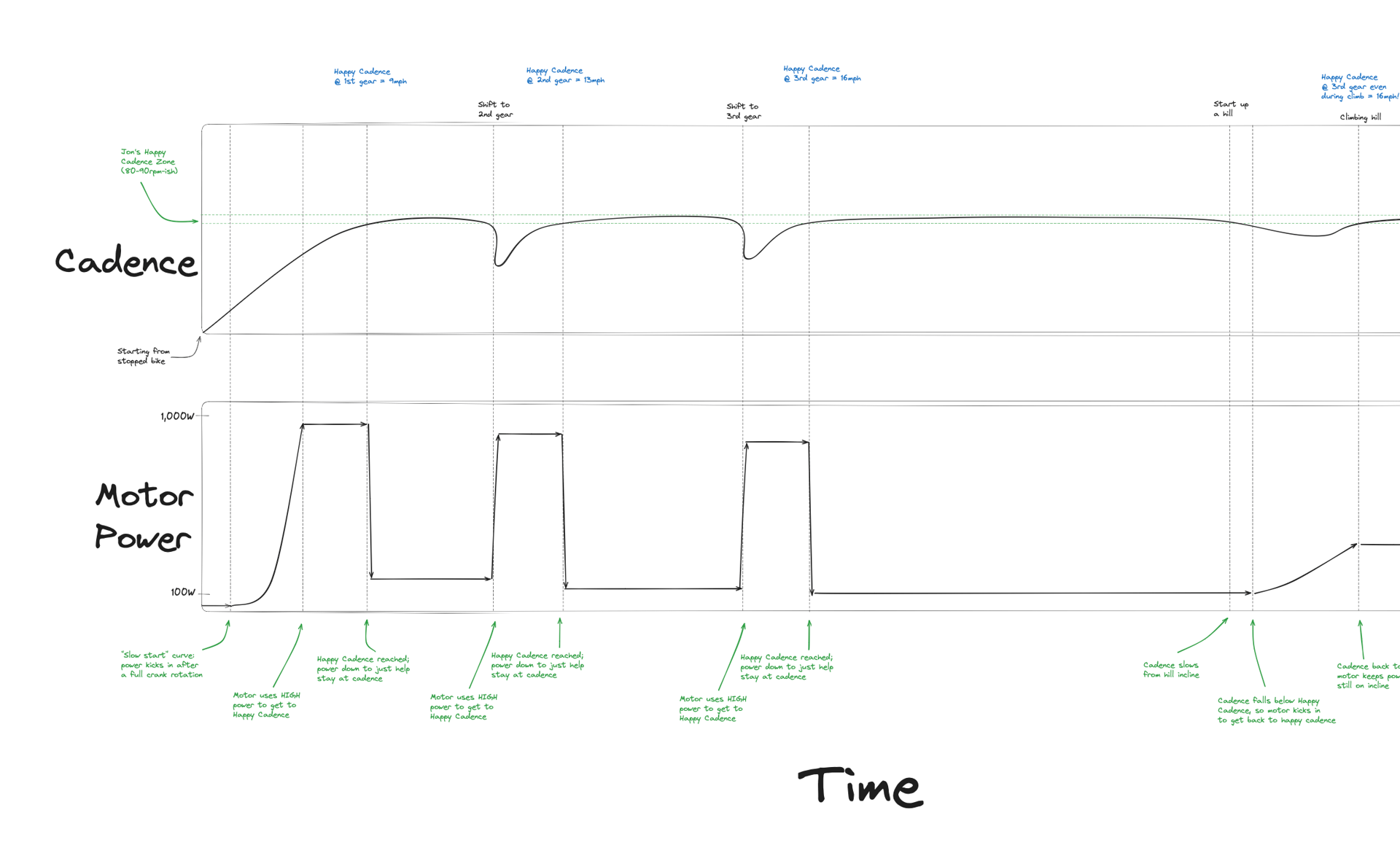 Ideally the motor shouldn’t care about actual road-speed (miles per hour) or how much torque I’m physically pushing into the pedals at any given cadence. It should see that the cadence is below my ‘happy’ threshold (let’s say 85-95rpm) and kick in with a lot of power (gradually, though) to help me get that cadence up to my happy cadence. Once there, it should only add or sustain enough wattage to keep my cadence up at that happy cadence level.